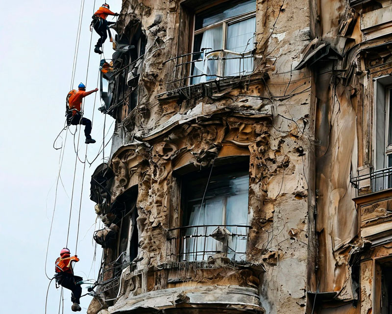 Ремонт, требующий выполнения работ на высоте, выполняют профессиональные мастера с навыками промышленных альпинистов. К высотным работам относятся монтажные работы на высоте, покраска, отделка и утепление фасадов, оштукатуривание, восстановление целостности элементов отделки зданий и др.